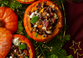 Gevulde pompoen met linzen, pecannoten en cranberry's