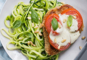 10. Serveer de courgetti met de gegratineerde schnitzels caprese en wat geroosterde pijnboompitten.
